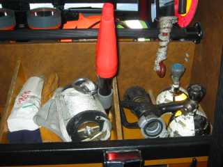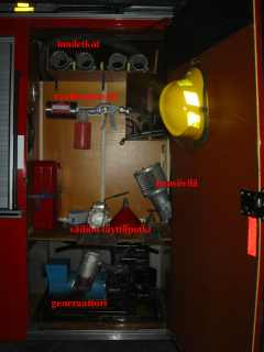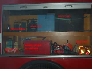 Vänstra framskåpet![]() Hydrauliska räddningsverktyg, yxor, airbagsverkytg mm. |